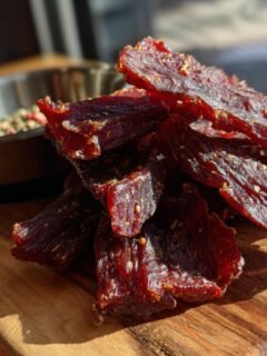 When stored in an airtight container at room temperature, this jerky should stay good for about 2 weeks. Make sure it’s completely cooled before you seal it up! If you live somewhere super humid, or you just want to be extra sure, popping it in the fridge will extend its life even further.